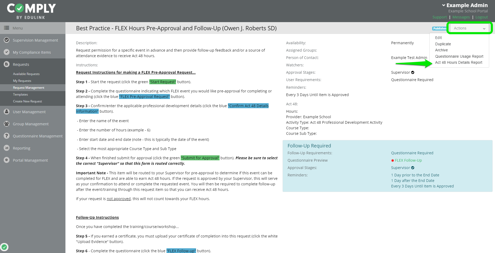 Districts can also gather all Act 48 details from end users in one place called an Act 48 Hours Details Report. If a Request item includes Act 48 details, this usage report is available and displays all the applicable Act 48 information in an Excel spreadsheet.