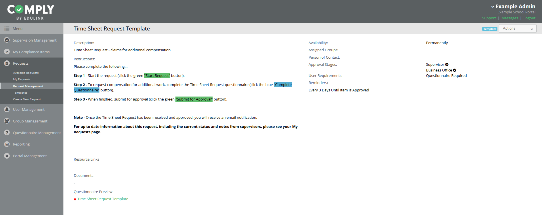 This item can be utilized by employees to request additional compensation. The request includes a questionnaire or form that the employee completes, indicating the specific details of work completed. Once the request is submitted, supervisors and administrators facilitate a chain of approval. Throughout the process, the employee receives email updates. At any time, the employee can log into Comply, access his or her My Request page, and see the current status of their request. All completed questionnaires/forms and uploaded evidence are documented within the system and, if desired, can be printed by the employees and/or administrators.
