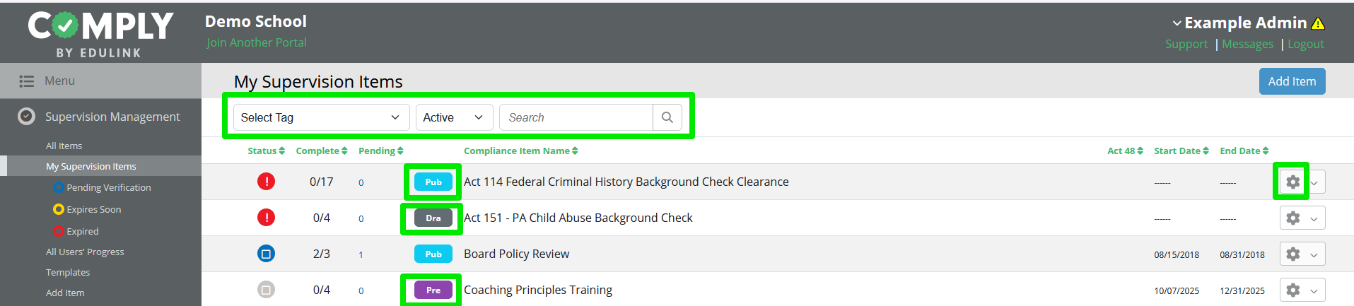 With this update, several changes have been made to the functionality of Compliance items. These changes primarily will impact Clearance items, but the related options are available for all Compliance items.